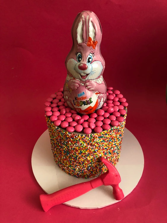 Freckled Smashcake filled with lollies & topped with a pretty pink bunny!