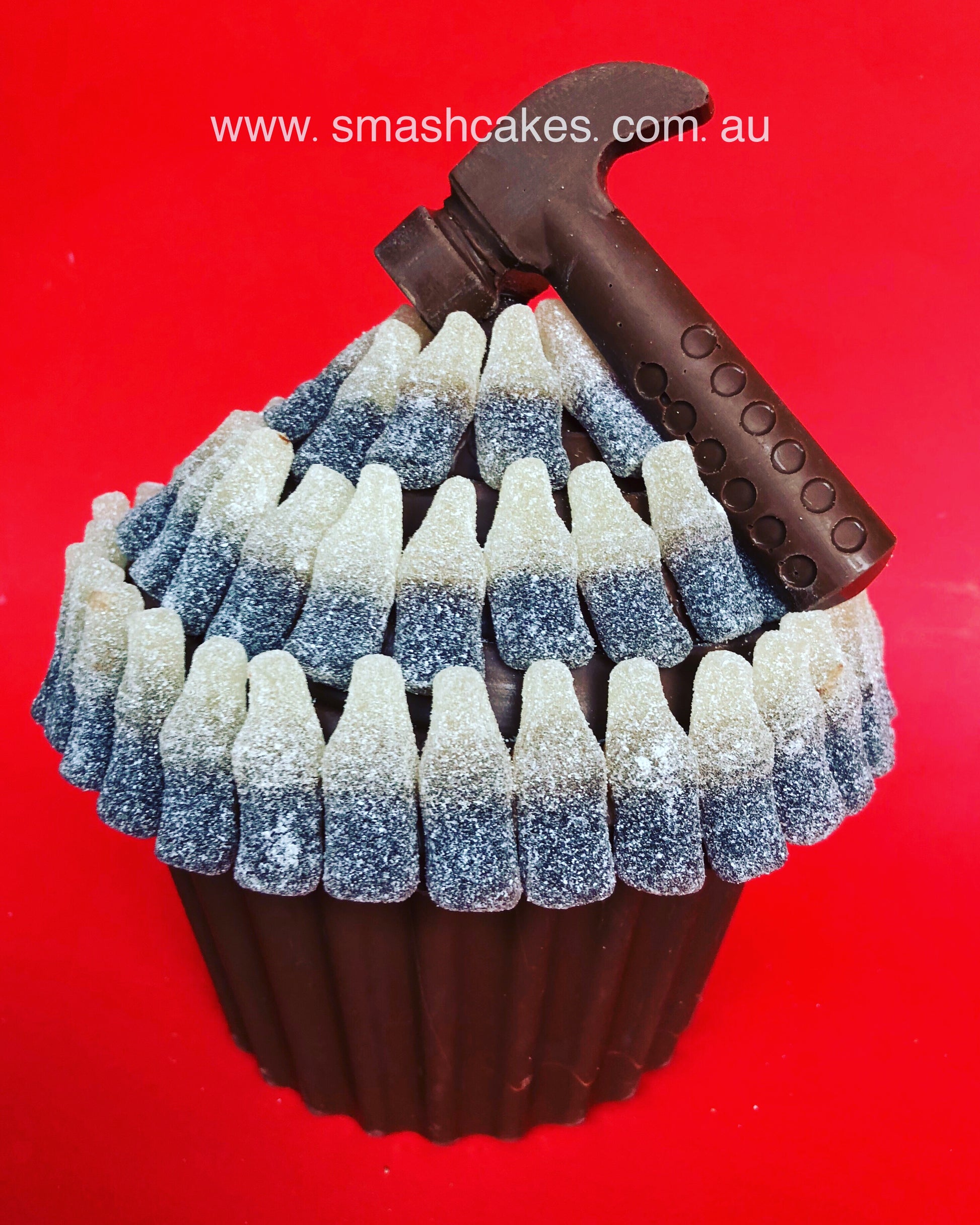 Our Belgian Chocolate Smashcake topped with Sour Cola Bottles & filled with lollies.